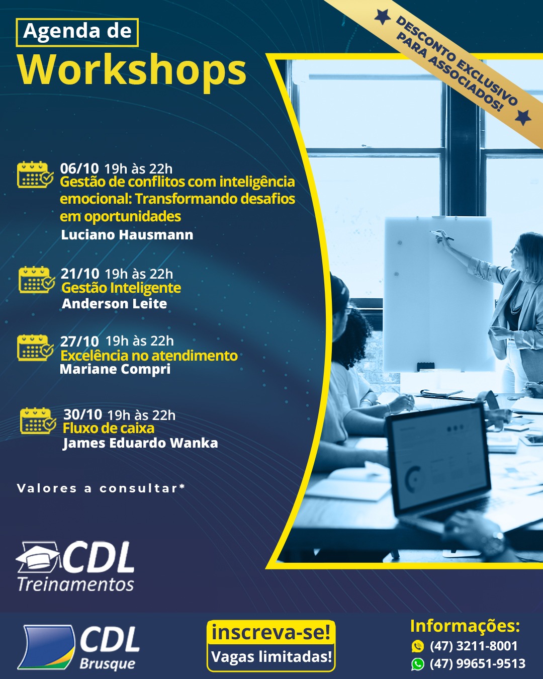 A programação inicia no dia 6 de outubro, com o workshop “Gestão de conflitos com inteligência emocional: transformando desafios em oportunidades”, ministrado por Luciano Hausmann. Na sequência, em 21 de outubro, ocorre o encontro sobre “Gestão Inteligente”, conduzido por Anderson Leite. Já no dia 27 de outubro, a especialista Mariane Compri apresenta o tema “Excelência no atendimento”. Encerrando a agenda, em 30 de outubro, James Eduardo Wanka ministra o workshop “Fluxo de caixa”. Todos os encontros acontecem das 19h às 22h, na sede da entidade.