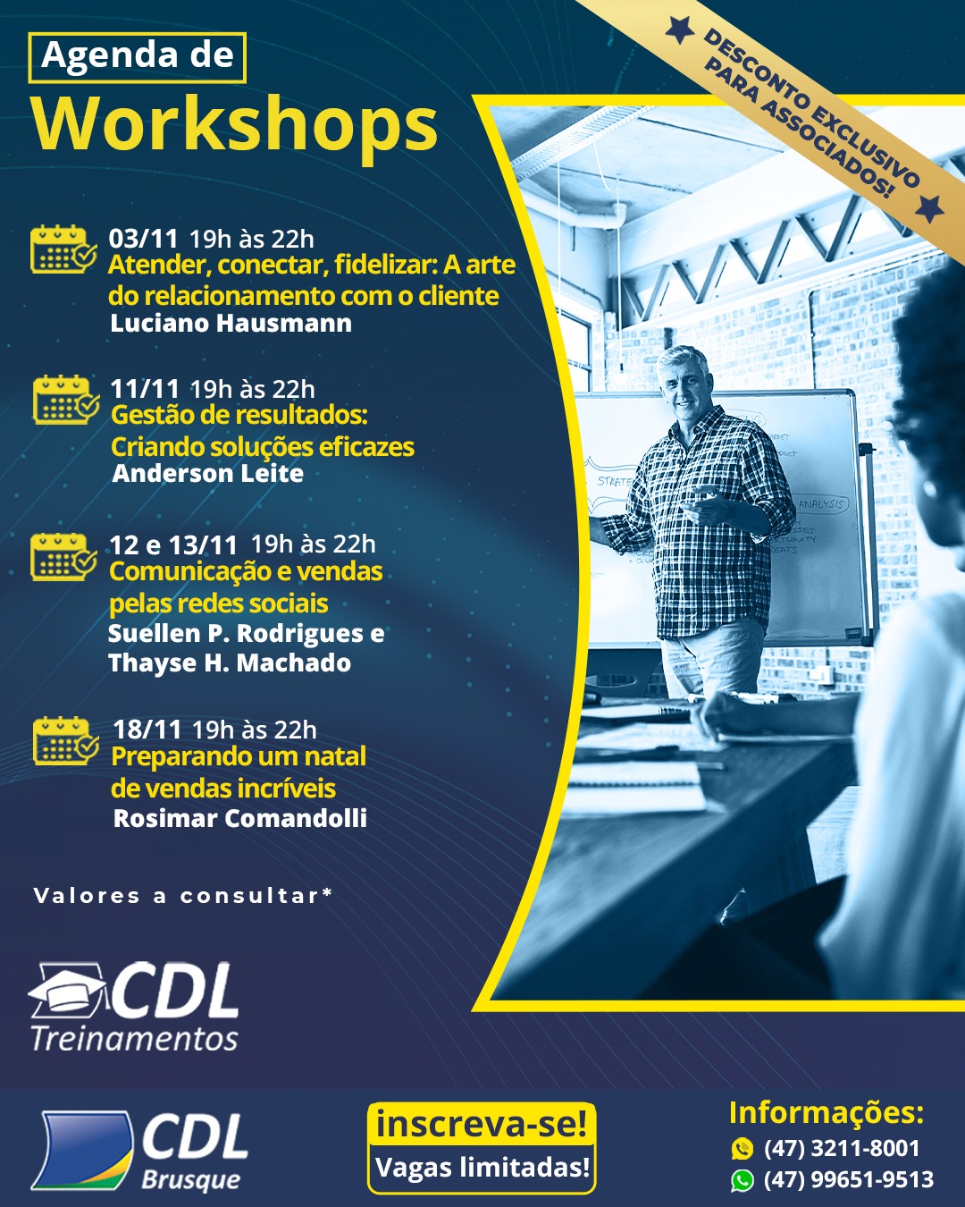 As inscrições para os workshops podem ser realizadas diretamente com a CDL Treinamentos, pelos telefones (47) 9 9651-9513 ou (47) 3211-8005. O investimento varia conforme a carga horária e o conteúdo de cada curso, com condições especiais para associados da CDL Brusque.